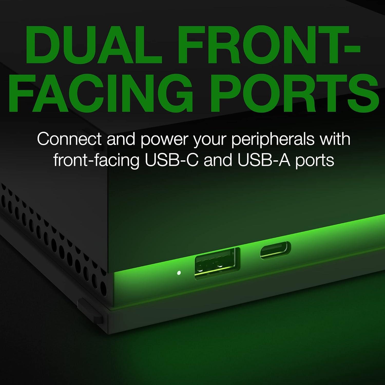 Immerse yourself in the game with Game Drive Hub for Xbox. Build a premium Game Vault with 8TB of storage, while the bold design of the hub complements your whole Xbox gaming station. The built-in LED light bar illuminates your gaming center in Xbox green, while dual front-facing USB-C and USB-A ports keep all your essentials charged and ready to rock.